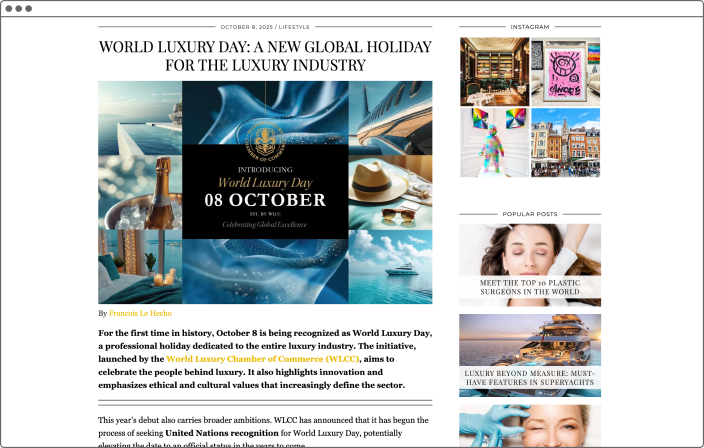 World Luxury Day is the first global, professional holiday for the entire luxury industry. It is a day dedicated to honoring the people, artistry, innovation, and ethical progress that define the world of luxury across all sectors. World Luxury Day was initiated by the World Luxury Chamber of Commerce (WLCC).